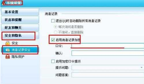 技巧2:对付这种偷窥好友信息、聊天纪录的工具,最好的防范办法就是对聊天记录进行加密。点击面板中的“系统设置”命令,接着在弹出的 “qq设置”面板中,选择“安全设置”下面的“本地信息安全”选项,选中“启用聊天记录加密”选项,在设置好需要的密码即可。
