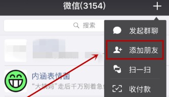 单击“+”按钮后,选择“添加朋友”选项,如下图所示。