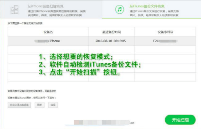 1.打开TG聊天记录恢复软件,在软件主界面的顶部可以看见两种恢复模式,我们已经使用iTunes备份了数据,所以这里选择“从iTunes备份文件恢复”功能模式,然后即可看见软件列表中手机设备和备份日期等信息,如果备份了多个文件,请选择要恢复的苹果设备和最新的备份时间,然后点击“开始扫描”按钮。