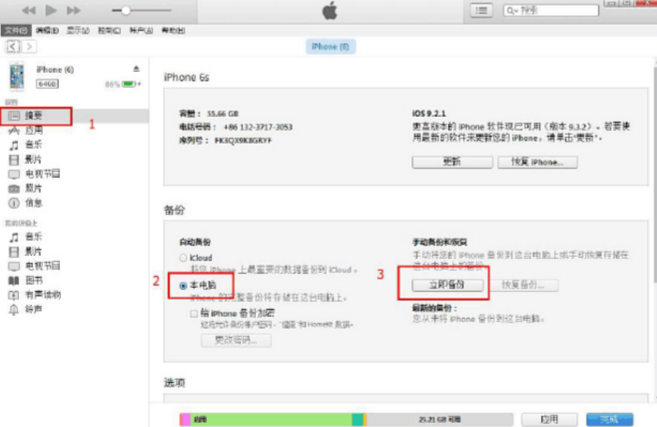 1.将手机连接电脑,打开iTunes,点击顶部手机图标,然后进入摘要界面选择“本电脑”,点击“立即备份”将手机数据同步备份到电脑上就可以了;