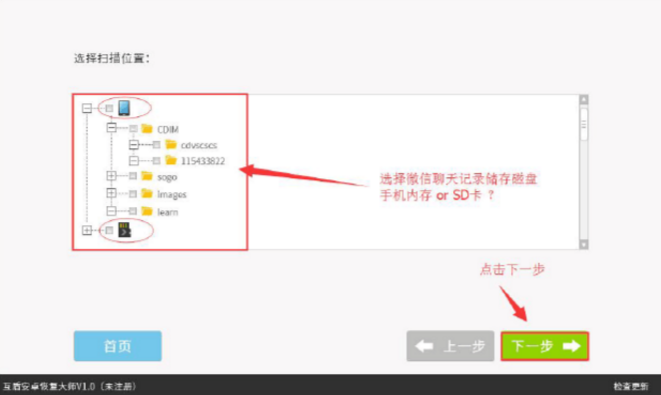 2.选择数据扫描分区,我们应该都知道安卓手机一般有两个储存空间,手机内存和外置SD卡,请用户选择删除TG聊天记录所在位置。